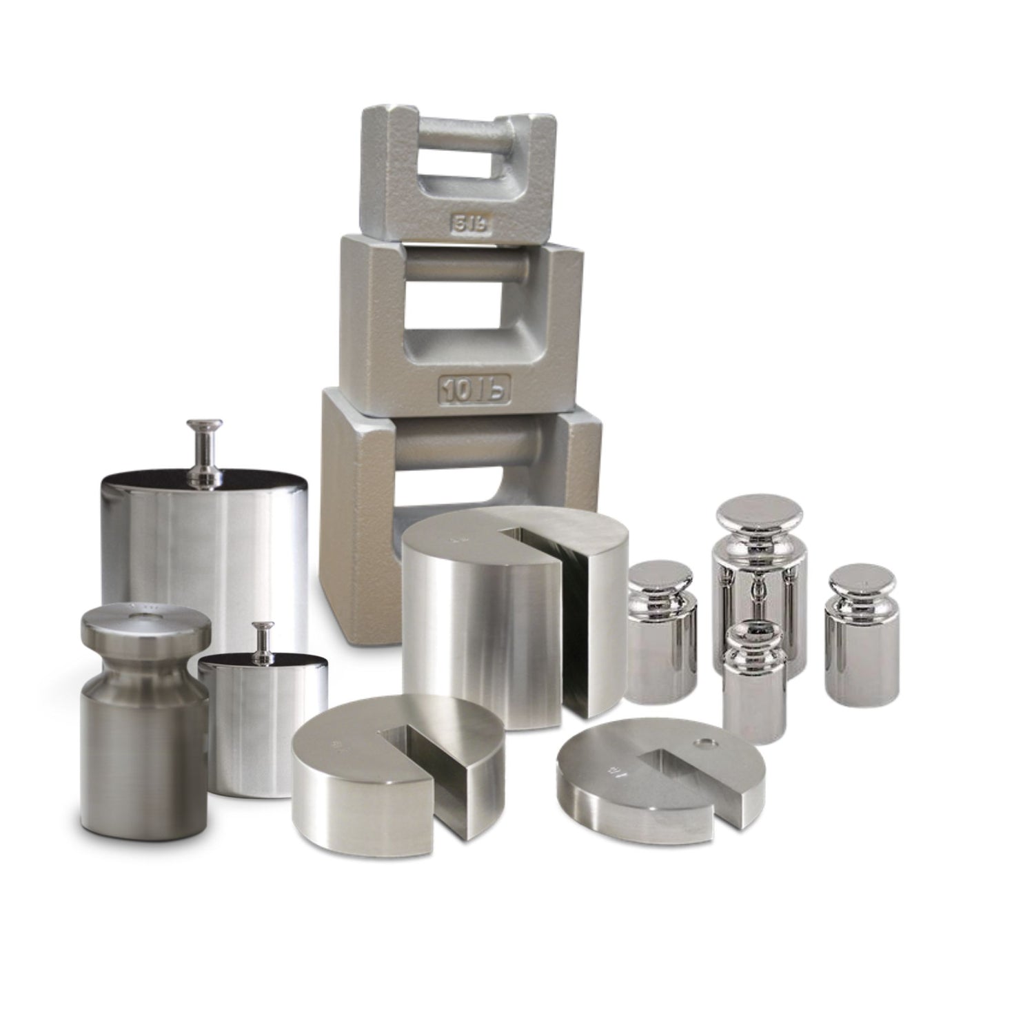 These individual weights in either stainless steel or cast iron are used to verify mass at an industrial usage level of accuracy, specifically NIST Class F.